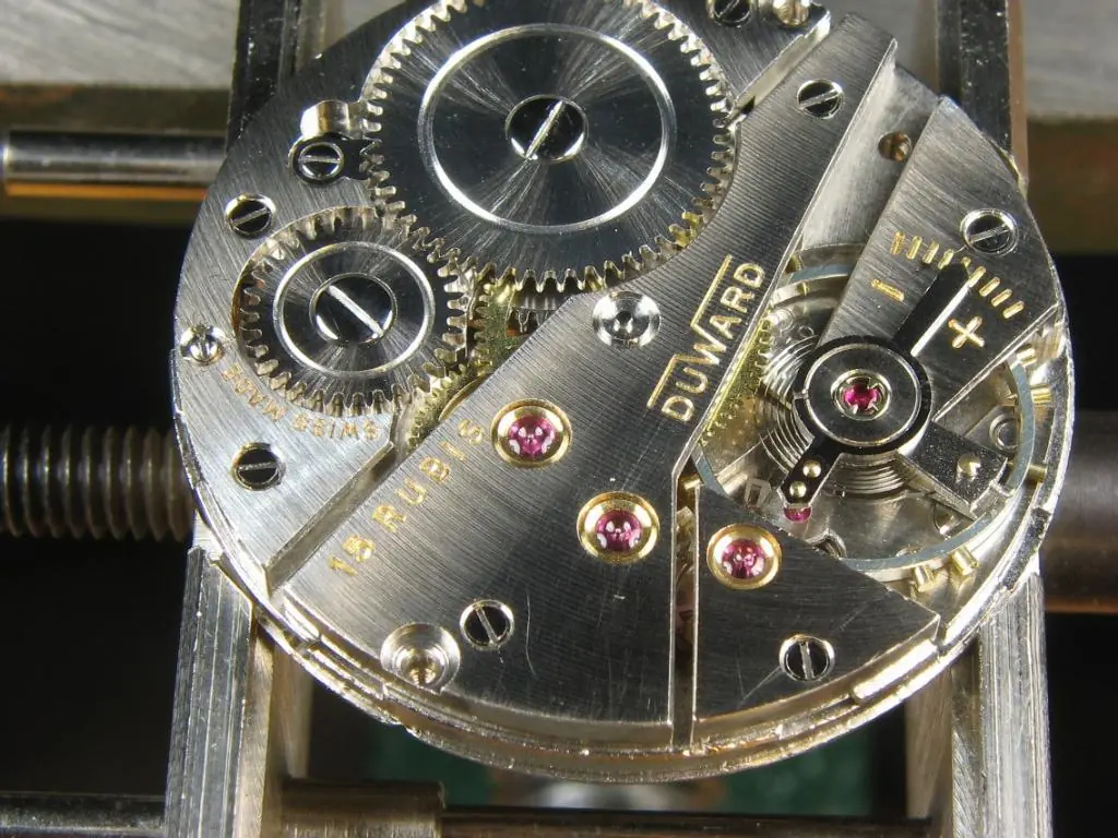 Uno de los grandes atractivos de los relojes mecánicos, es ver el contenido de su estructura interna. Observar a detalle todos esos pequeños componentes enlazados perfectamente para cumplir su trabajo nos llena de preguntas sobre dicho funcionamiento. La fascinación por la mecánica en nuestros gustos y aficiones por los relojes nos lleva a muchos a intentar, al menos, entender este proceso mecánico ajustado tan finamente para obtener aquellos resultados tan recurrentes y necesarios en nuestra vida diaria: la lectura de la hora y minutos. En este artículo, se explicará de manera detallada el funcionamiento básico de un reloj de cuerda, haciendo mención de los nombres comunes de los componentes, la distribución dentro de un calibre de estos y el funcionamiento entre ellos para tener una mejor comprensión del principio de función de este tipo de movimientos mecánicos. El calibre mecánico a detallar es un Duward de carga manual de 15 rubís, cuyo ebauche fue provisto por A. Schild. Calibre 1130 de 13”’, 29 mm. de diámetro y 3.9 mm. de espesor, frecuencia de 18,000 a/h y reserva de marcha de 38 horas, manufacturado en 1965. La imagen del calibre en cuestión: