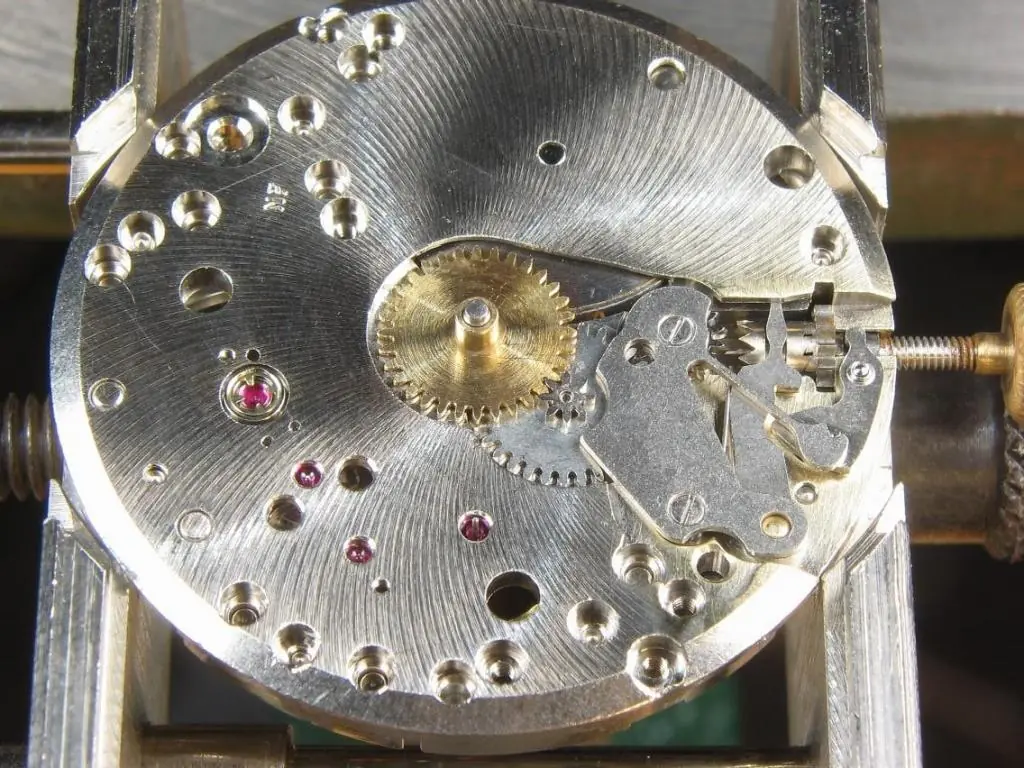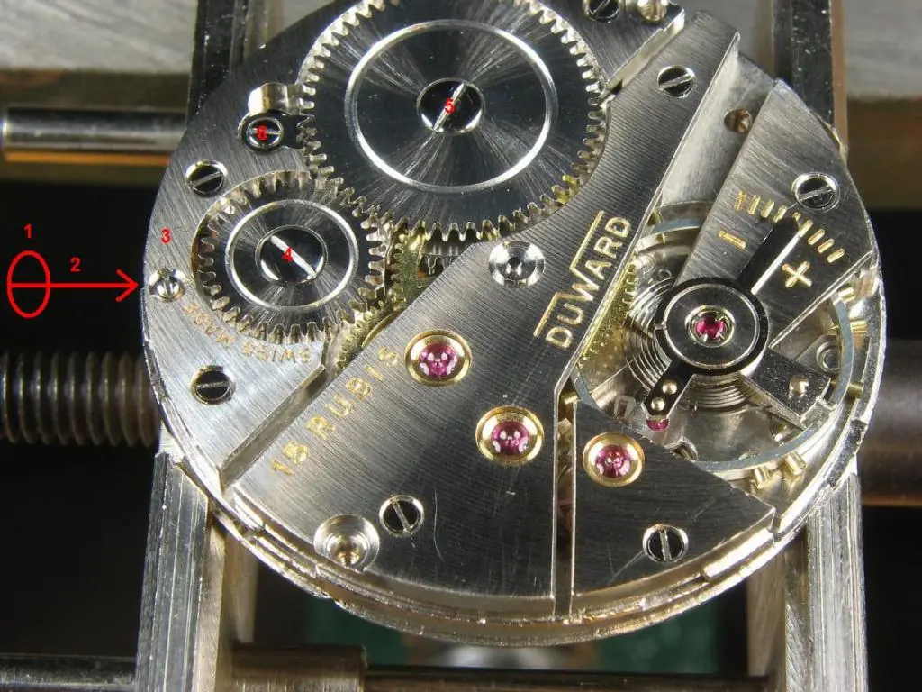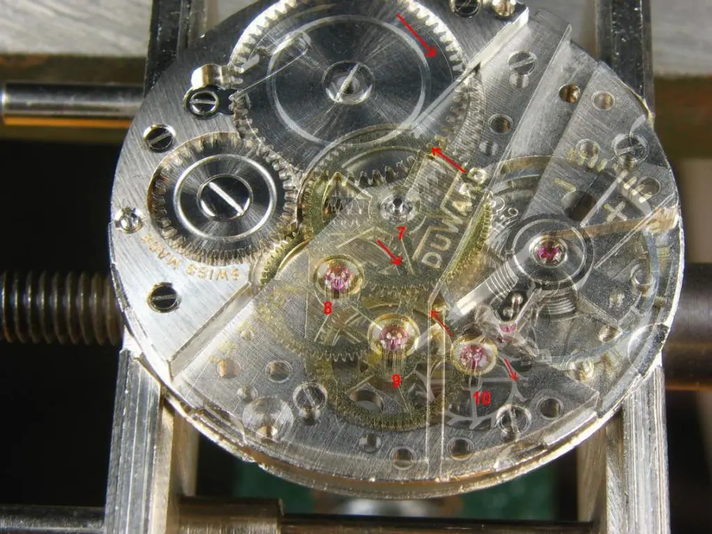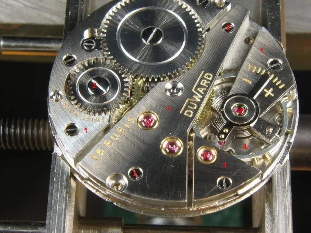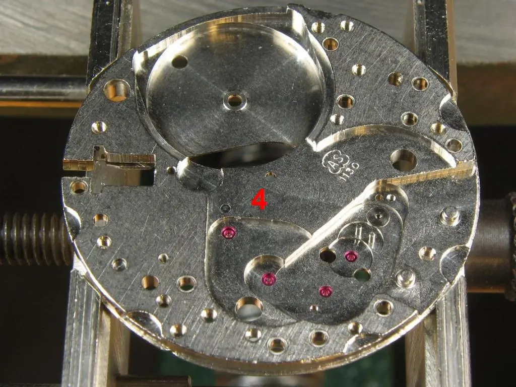 1. Puentes. 2. Tornillos varios. 3. Pivotes de rubí, para evitar la fricción del constante movimiento de los ejes de los engranes y el conjunto volante-espiral. 4. Platina. (cambio de imagen para tener una vista detallada)