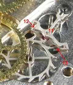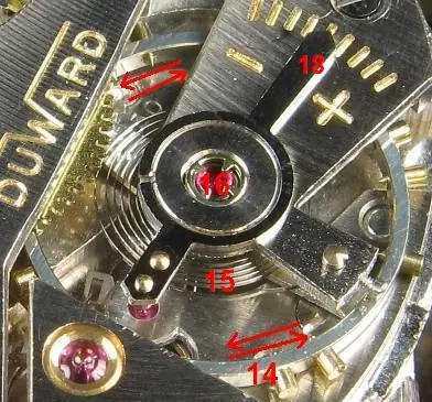 Este movimiento en conjunto y coordinado con la presión proveniente del tren de rodaje mueven al conjunto volante-espiral mediante el choque constante del áncora con el rubí rodante (17), en la imagen anterior, del costado izquierdo está señalado, al girar de forma bi-direccional, choca con el áncora, esta inercia mueve al mencionado conjunto volante-espiral. El cual esta compuesto por el volante (14), el espiral (15), el eje del volante (16) y el rubí rodante: