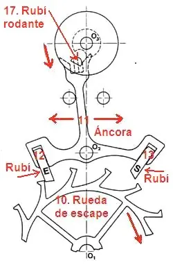 La rueda de escape, es el último componente del tren de rodaje, esta ejerce fricción y fuerza controlada con el áncora o paleta (11), por cada impulso, hay una entrada de presión en el rubí o labio de rubí posicionado de lado derecho de la paleta (12) y una salida o escape en el rubí o labio de rubí posicionado de lado izquierdo de la paleta (13). La constante fricción entre la rueda de escape y el áncora, es el típico “tic-tac” de todos los relojes de cuerda mecánicos.