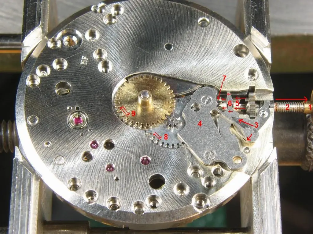 El funcionamiento no es tan complicado, primero ejerzo presión de salida a la corona de remontar (1), esta mueve a la transmisión o tija (2), inmediatamente acciona al tirete (3) este tira y presiona al muelle flexible del tirete (4), el cual recorre con dicha fuerza al piñón deslizante (5) mediante la báscula (6) y enbona con la rueda de transmisión (7), al dar vuelta a la corona de remontuar este gira en ambas direcciones moviendo así a la rueda de las horas (8) y esta a la de los minutos (9). Sobre este sistema, se encuentra la esfera, la cual tiene insertadas las manecillas de hora y minutos. De esta forma ajusto, la hora y minutos exactos y listo! a dejar que el movimiento haga su trabajo. El resto de los componentes, tiene su nombre específico: