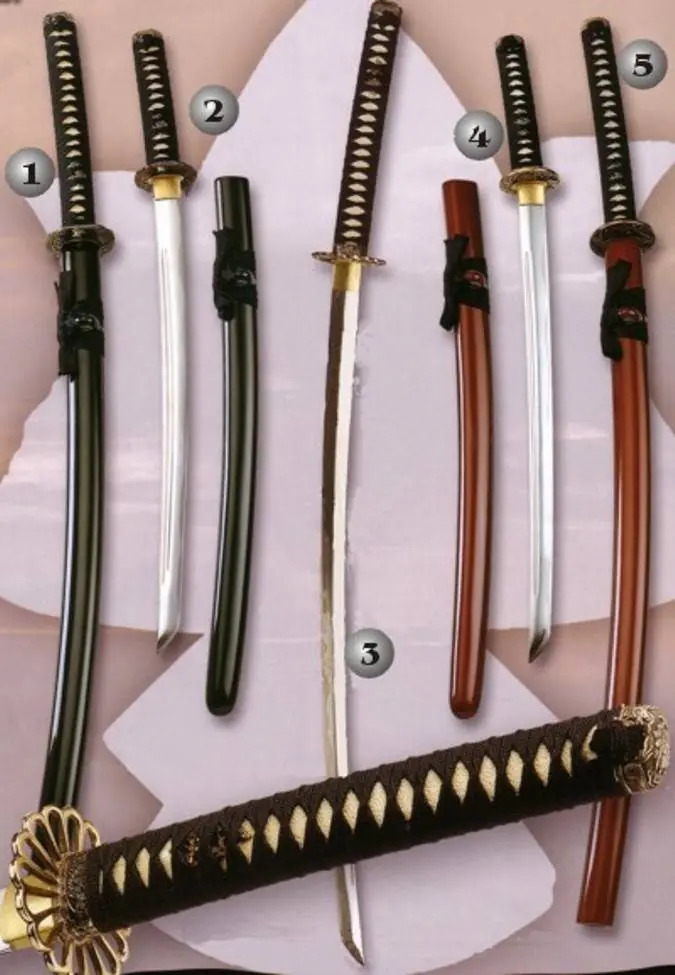 La austera katana fue en un primer momento una recia espada de hierro importada de la península coreana o de China, pero con el tiempo, hacia el siglo IX, se fue depurando en un sable más ligero y afilado. La espada japonesa se compone de hoja y empuñadura (tsuka) y a veces llevaba una guarda (tsuba) bellamente decorada en oro y plata. La hoja estaba hecha de hierro combinado con carbono y tenía un núcleo de acero más blando que le confería una inusitada flexibilidad; se componía de filo, punta, parte posterior y shinogi (un acanalamiento longitudinal situado entre el filo y la parte posterior), partes éstas que tenían funciones diferentes en el combate.