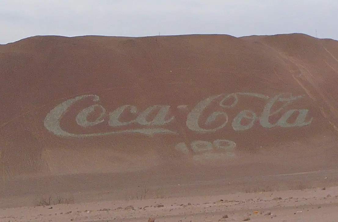 Cita :En el centésimo aniversario de Coca-Cola, se construyó en el norte de Chile el logo más grande del mundo hecho con 70.000 botellas de coca-cola. Sus medidas son de 120 m x 50 m.