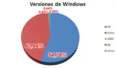 Windows XP 54,78%; Windows Vista 43,84%; Windows 2000 0,44%, Windows 98 0,44% y suman demás versiones un total de un 0,50%.