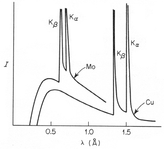 Distribución de longitudes de onda de los rayos X que se producen en tubos convencionales de rayos X en donde el material anódico es cobre (Cu), molibdeno (Mo), cromo (Cr) ó wolframio (W) . Sobre el llamado espectro contínuo aparecen las llamadas líneas características K-alpha (Kα) y K-beta (Kβ). El principio de los espectros contínuos aparecen a una longitud de onda que es aproximadamente 12.4/V, en donde V representa los kV entre filamento y ánodo. Para una misma tensión entre ánodo y filamento, sólo se excitan las radiaciones características del molibdeno (figura de la izquierda).