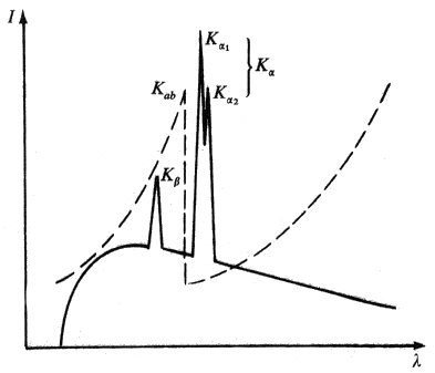 Espectro emitido por un ánodo metálico mostrando las longitudes de onda características. Sobre el mismo gráfico, aunque referido a un eje de ordenadas de absorbancia (no dibujado) se muestra la variación creciente y discontínua de la absorción (línea de trazos) de un determinado material, lo cual da idea de su uso como filtro para obtener radiación monocromática, separando el doblete Kα1 Kα2 del resto del espectro.