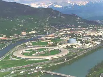 Imagen aérea de las instalaciones del sincrotrón del ESRF en Grenoble (Francia). Obsérvese su geometría circular.