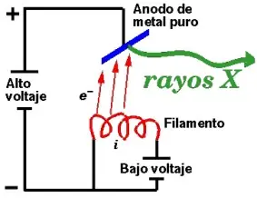 Esos 50 kV se suministran como diferencia de potencial (alto voltaje) entre un filamento incandescente (por el que se hace pasar una corriente i de bajo voltaje, unos 5 A a unos 12 V) y un metal puro (normalmente cobre o molibdeno), estableciéndose entre ambos una corriente de unos 30 mA de electrones libres. Desde el filamento incandescente (cargado negativamente) saltan electrones hacia el ánodo (cargado positivamente) provocando, en los átomos de este último, una reorganización electrónica en sus niveles de energía.