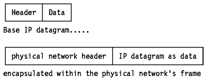 El datagrama IP es la unidad de transferencia en la pila IP. Tiene una cabecera con información para IP, y los datos relevantes para los prots superiores.