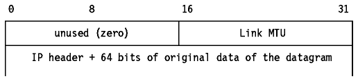 Si un "router" implementa el protocolo de resolución de caminos MTU, el formato del mensaje "Destination unreachable" se cambia por el código 4 para incluir el MTU del enlace que no pudo aceptar el datagrama.