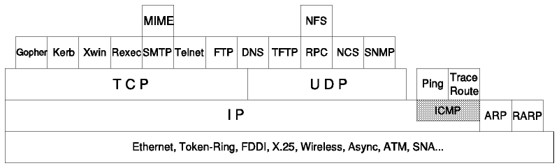 * ICMP usa IP como si ICMP fuera un protocolo del nivel superior(es decir, los mensajes ICMP se encapsulan en datagramas IP). Sin embargo, ICMP es parte integral de IP y debe ser implementado por todo módulo IP.