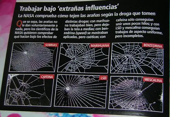 Los científicos de la NASA quisieron comprobar que hacían bajo los efectos de distintas drogas: con Marihuana trabajaban bien, pero dejaban la tela a medias; con benzedrina (speed) se mostraban aplicadas, pero caóticas; con cafeína solo conseguían unir unos pocos hilos; y con LSD y mescalina conseguían trabajos de aspecto uniforme pero incompletos.