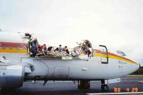[color=#000000]Quizás la avería más espectacular relacionada con la descompresión explosiva fue la registrada el 28 de Abril de 1988 por un Boeing 737-200 de Aloha Airlines (a la que pertenecen las fotos).