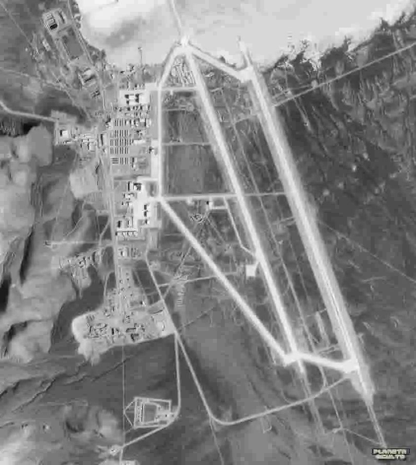 Durante la cumbre de la Guerra Fría satélites espía soviéticos obtuvieron fotografías del área de Groom Lake, pero éstas solo aportan modestas conclusiones acerca de la base. Muestran una base indescriptible, pistas de aterrizaje, hangares, depósitos de combustibles y agua, casamatas semi-subterráneas, etc., pero nada que apoye algunas de las teorías más descabelladas sobre instalaciones subterráneas. Las imágenes posteriores de satélites comerciales muestran que la base ha crecido, pero permanece igual superficialmente.
