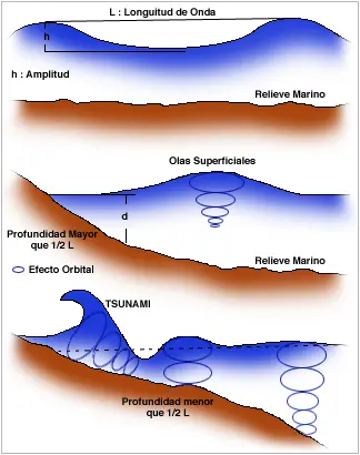 Los tsunamis tienen normalmente longitudes de onda que superan los 50 kilómetros y pueden alcanzar hasta 1000 kilómetros, en tal caso el efecto orbital es constante y vigoroso en cualquier parte del fondo marino, ya que no existen profundidades semejantes en los océanos.