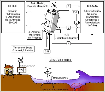 Un terremoto grado 6.5 Richter activa el sistema. (1) Vía satélite, el sismógrafo informa del evento a EE.UU. (2) El procesador de la NOAA envía dos mensajes simultáneos: (2A) Alerta al computador en Chile de un posible Tsunami. (2B) El procesador interroga al mareógrafo sobre cambios en el nivel del mar. (3) El mareógrafo responde. (4) El procesador califica la información y envía una señal de alarma.