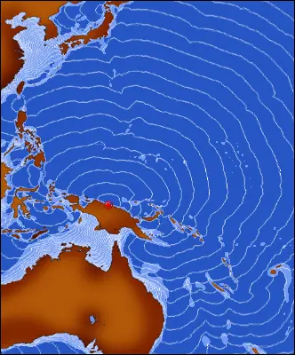 Carta de propagación de la onda del tsunami de Papua Nueva Guinea, ocurrido en Julio de 1998. Las isocronas muestran a intervalos de 30 minutos el tiempo de avance del frente de onda
