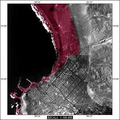 Al localizar los puntos de referencia sobre el emplazamiento de la ciudad de Arica, e interpolar una curva que los una, se visualiza el área aproximada de inundación.