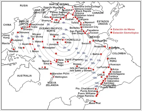 Estaciones de información del Sistema Internacional de Alarma de Tsunami del Pacífico y los tiempos de propagación de un tsunami desde Honolulú. [SHOA, 1995]