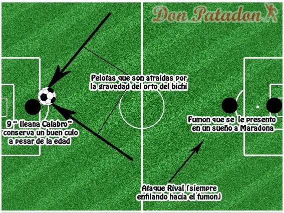 La base de este esquema táctico se basa en una única cosa, el culo que tiene el Bichi Fuertes. Al igual que Ileana Calabro, el Bichi Fuertes conserva un hermoso culo a pesar de la edad y lo explota de la mejor manera. En la jerga futbolística se dice que “la Pelota va al jugador”, en este caso la frase utilizada es “La pelota va al ojete del Bichi”. Generalmente esta estrategia funciona, pero una de sus falencias claves es la defensa, la cual esta comandada por un defensor que tuvo una aparición en un sueño de Maradona y por eso fue a un Mundial, al parecer este defensor todavía esta inmerso en ese sueño puesto que que cada vez que algun rival encara hacia su sector este jugador permanece como dormido y es pasado fácilmente por los rivales de turno, algunos dicen que este defensor sueña con que el césped del “Cementerio de los Elefantes” esta cultivado en su totalidad por Cannabis.
