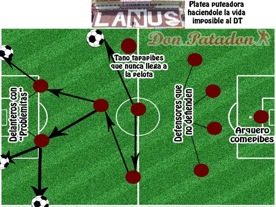 Una estrategia que se basa en tener un gran mediocampo con muy buen pie para que sus delanteros se erren los goles. Este sistema táctico se basa en tener mediocampistas virtuosos en el manejo de la pelota, los cuales arman grandes jugadas colectivas hilvanando a veces mas de 6 pases para que luego Castillejos o Regueiro mande la pelota 5 metros por arriba del travesaño o le tire una masita al arquero. En este esquema podemos apreciar que contamos con un mediocampista de gran pasado internacional, un Campeon del mundo como Camoranesi, el cual solo es contratado para aportar algo de marketing por mas que no llegue a ninguna pelota larga y que su única actividad sea la de cagarle el lugar a un pibe de inferiores que correría mas que el. Tenemos también por su parte a una platea la cual se encargara de marcarle error por error al Director Tecnico de turno mediante sonoras puteadas.