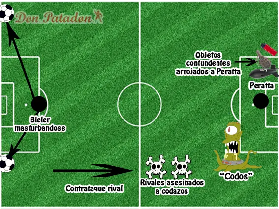 Este sistema se denomina “Sistema estratégico de defensa con codo al mentón del rival”, para ello se utiliza un defensor de gran altura (Para que el codo quede a la altura del mentón del contrario). La funcionalidad de este sistema es muy simple, debemos contar con un delantero que se erre goles en el área rival así se inicia el contragolpe rival, el cual indefectiblemente será conducido hacia nuestro defensor apodado “Codos”, este defensor deberá ser grande en años asi el rival pensara que lo puede pasar fácilmente, cuando el rival encade a nuestro ejecutor de codazos inmediatamente saldrá en el carrito de los lesionados, el codazo debe darse por detrás para que el arbitro no vea, aunque en el futbol argentino los árbitros nunca ven nada. La única contrariedad en este sistema táctico esta en el arquero, el cual por contestarle recibe como respuesta por parte de la otra hinchada, botellas, encendedores, misiles, granadas, reactores nucleares y todo tipo de elementos contundentes que la parcialidad visitante tenga a mano para arrojársela a Peratta.