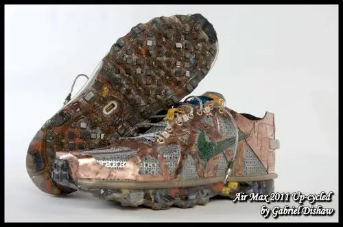 Teclas, memorias RAM, chips, condensadores, puertos usb, conectores, y un largo número de componentes inservibles a los que el artista da nueva vida convirtiéndolos en zapatillas, en el caso que les presento en nada menos que unas Nike Air Max+ 2011. Supongo que cómodas no son, pero como adorno no están nada mal.