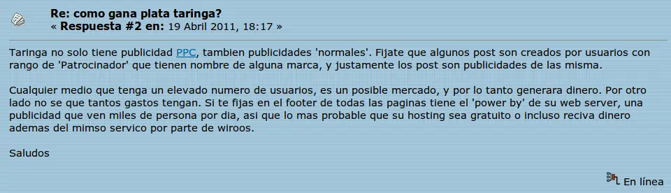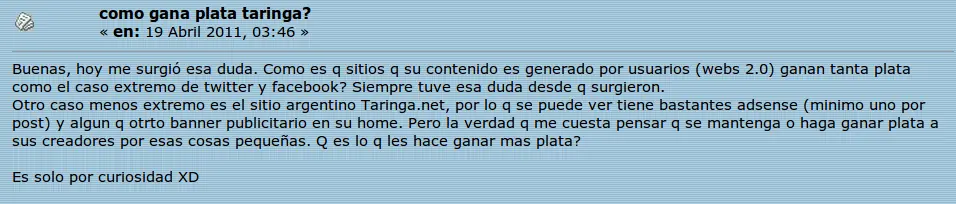 Por si no ven bien la imagen es una persona que pregunta cuanto dinero gana Taringa!