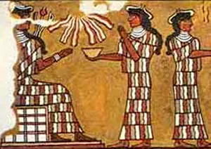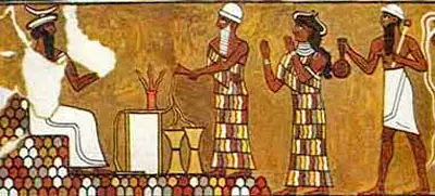 Aca vemos a Enlil (a la izquierda) atendido por los Iggigi. Pintura de Mari, Sumeria