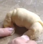 Como lo mostramos en la foto, con cada triángulo vamos formando un rollo, comenzando a enrollar desde la parte más ancha, tensando un poco la masa en la medida en que vamos avanzando. Esto es para que nuestro rollo quede ajustado.