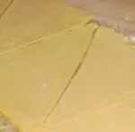 Cortamos el rectángulo en triángulos, como se muestra en la foto. Con estos triángulos iremos formando luego las medialunas.