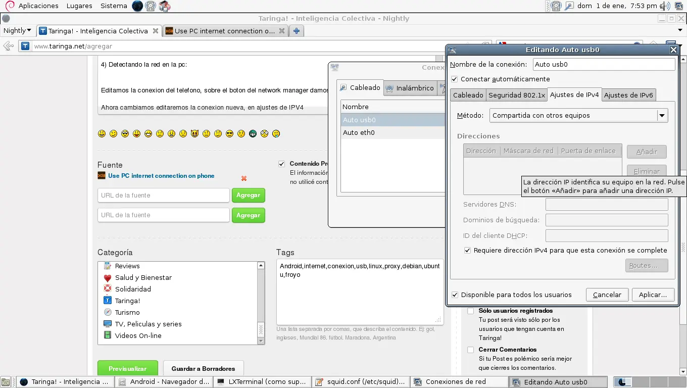 2) Si al introducir el comando #netcfg usb0 dhcp te dice "time expired" revisa que la conexion de usb este en modo "compartido con otros equipos".