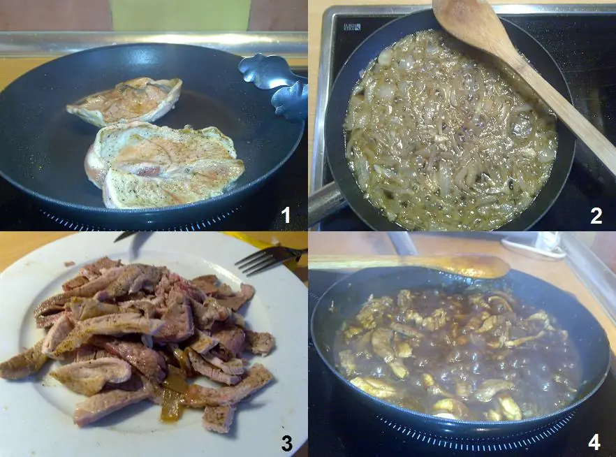 Salpimentamos los filetes de cerdo y mientras calentamos un poco de aceite de oliva en una sartén. Cuando esté muy caliente, doramos los filetes de cerdo (no es necesario que queden hechos del todo por dentro, ya se terminarán de hacer cuando los cocinemos con la salsa). Una vez hayamos terminado con los filetes, los apartamos y en la misma sartén sofreímos la cebolla picadita hasta que empiece a ponerse transparente. En ese momento añadimos la Coca-Cola, llevamos a ebullición y añadimos el medio sobre de sopa de cebolla.