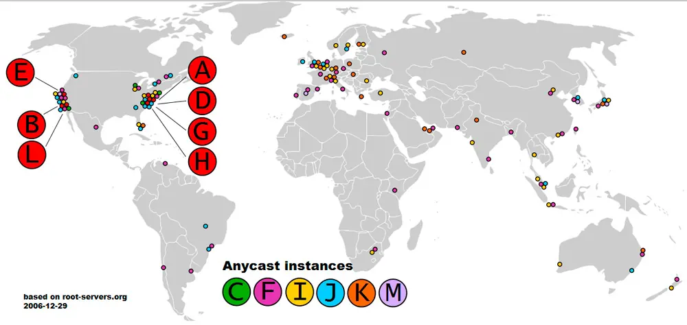 En el siguiente mapa se representan todos los servidores raíz, incluyendo los servidores distribuidos, que usan anycast.
