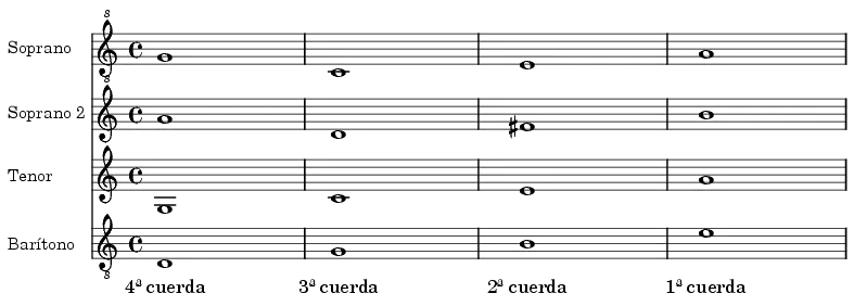 La afinación de las cuatro cuerdas, viendo al instrumento de frente y de derecha a izquierda es la siguiente: