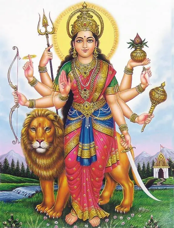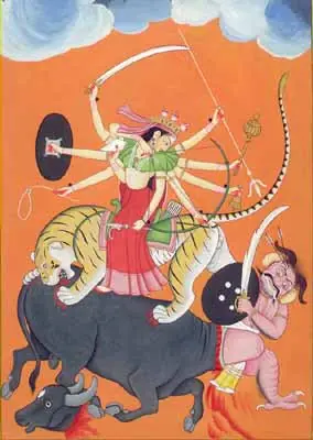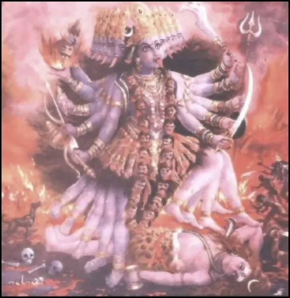 De la frente de Durga nace Kali, feroz con el ceño fruncido,con cara terrible, armado con una espada y una soga. Llevando el khatvanga extraño (cabezas decapitadas), adornado con una guirnalda de cráneos, revestida en la piel de un tigre, muy espantosa debido a su carne, con la boca enorme, temerosa con su lengüa hacia fuera, teniendo ojos rojizos profundos, llenando las regiones del cielo de ella con rugidos, bajando sobre impetuosamente y matando los grandes mazas del ejército, ella devoró a esas hordas de los enemigos de los devas.