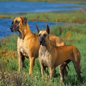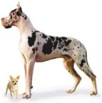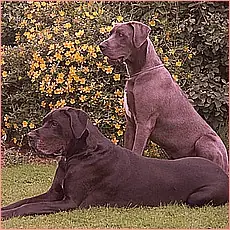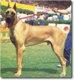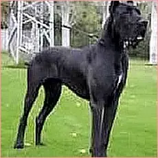 Descripcion: Afectuoso, grande y noble, el Dogo alemán (o Gran Danés) es fuerte y paciente. La cabeza es larga y estrecha, de gruesos belfos y morro cuadrado. Cuello largo y abombado, que le confiere un aspecto distinguido. Los ojos redondos son de color avellana y las orejas son colgantes cuando no están cortadas. Bien proporcionado: pecho ancho, lomo poderoso y patas largas y fuertes acabadas en pies de gato. Cola que se afina en la punta. Pelaje: corto, denso y apretado. Color: marrón cervato, azul, negro o arlequín.
