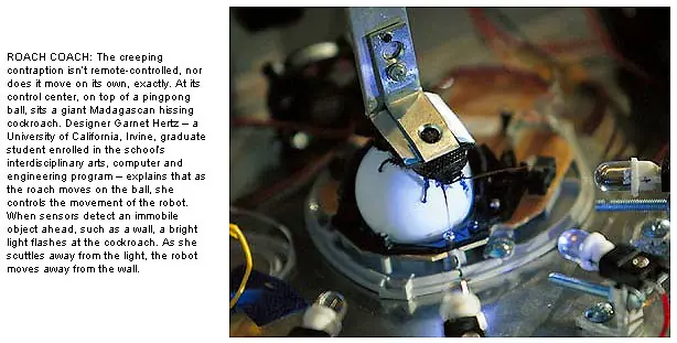 El sistema de interacción del insecto con el robot es similar a la esfera del mouse de nuestra PC. La cucaracha es colocada gentilmente en la parte superiór de la esfera y ésta trata de caminar hacia la luz de algunos leds de alta luminiscencia que atráen casi hipnoticamente al animal, las patitas se pegan a la superficie de la esfera haciendola girar con cada "avance" de la cucaracha.