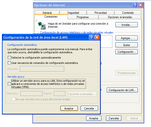 * Revisaremos que nuestro navegador Internet Explorer no este usando ningún Proxy. En el Internet Explorer Menú Herramientas / Opciones de Internet / Pestaña de Conexiones / Configuración de Red. Y quitaremos la opción de Utilizar un servidor Proxy para …………..