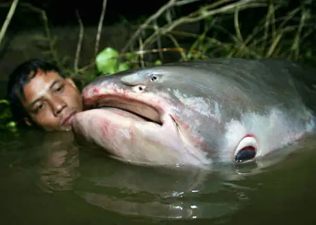 El Pangasiodon gigas es el pez de agua dulce mas grande del planeta. Su cuerpo desnudo y desprovisto de escamas puede sobrepasar los tres metros de longitud y los 295 kg. de peso. Su hábitat principal son las aguas del cauce bajo del sistema fluvial del Mekong, que abarca los países de Laos, Camboya, Tailandia y Vietnam.