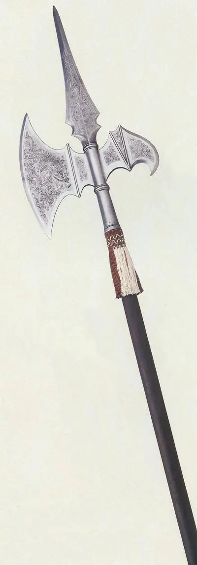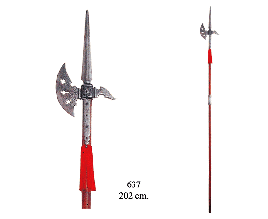 La alabarda es un arma enastada de astil de madera de unos dos metros de longitud y que tiene en su "cabeza de armas" una punta de lanza como peto superior, una cuchilla transversal con forma de hoja de hacha por un lado, y otro peto de punza o de enganchar más pequeño por su opuesto.