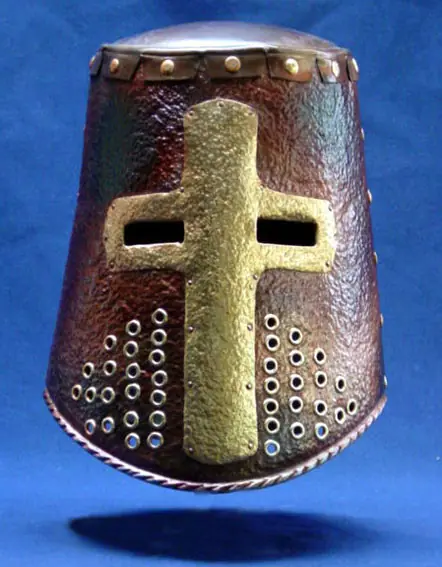 El casco ya era utilizado por los griegos, siendo una de las defensas personales más importantes dentro del campo de batalla, no sólo cumple una función militar, si no que también la cumple como social, decorativa y quizás no menos importante, de sugestiva protección ante cualquier peligro que "caiga del cielo". En la época que nos atañe, la protección nasal fue una introducción de los Normandos aproximadamente en el siglo XIII. Posteriormente para proteger toda la cabeza se crearon cascos cilíndricos de forma que cubrían toda la cabeza. Dichos cascos creaban serios problemas de respiración para los poseedores, así que exclusivamente eran utilizados en las batallas.