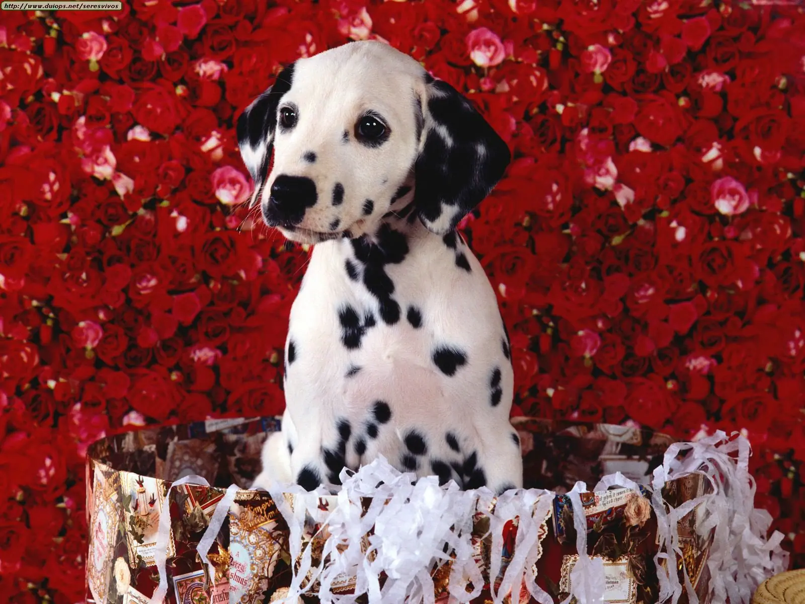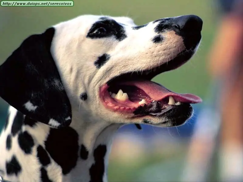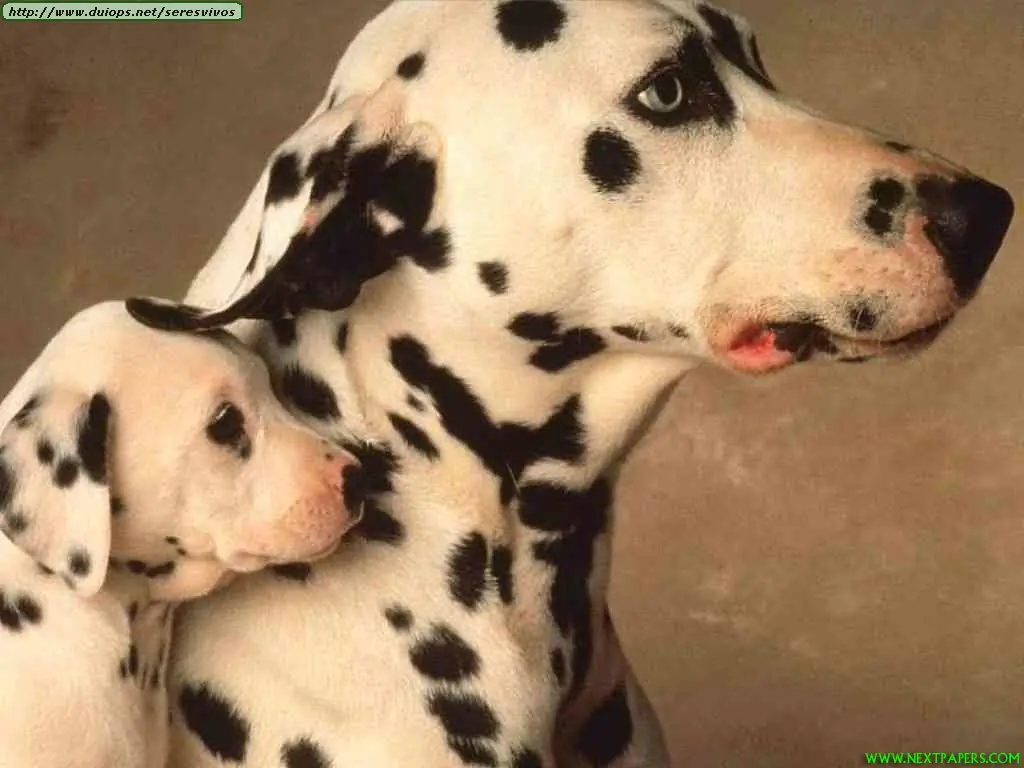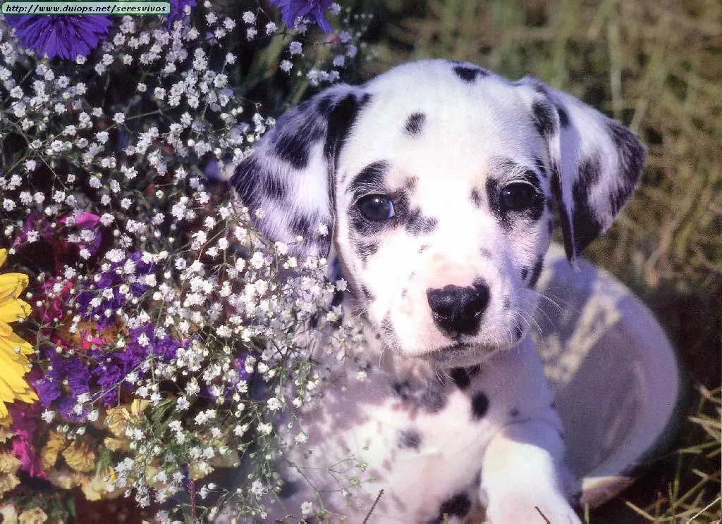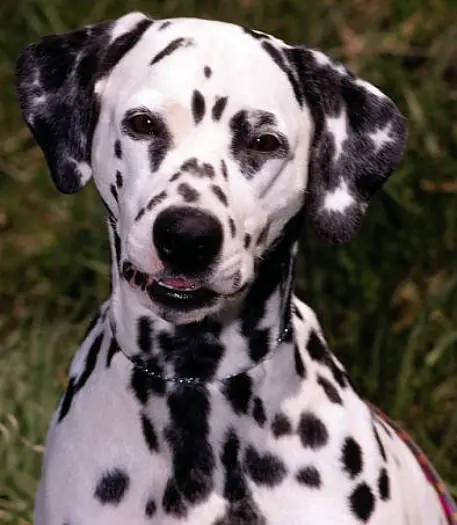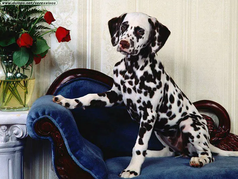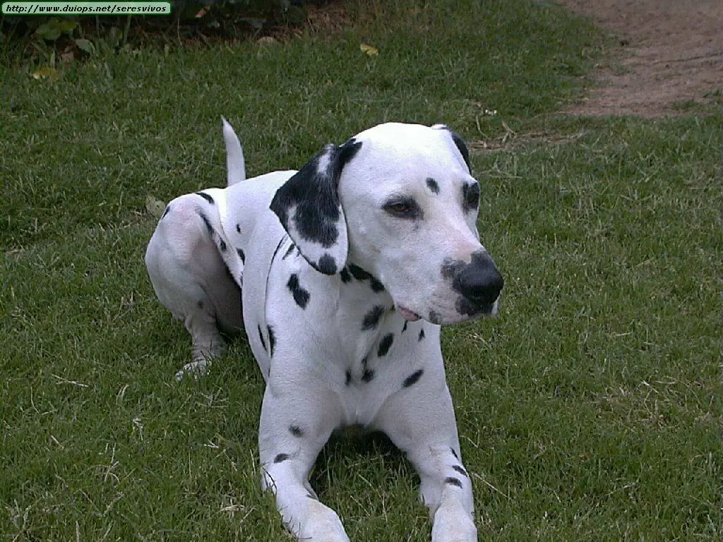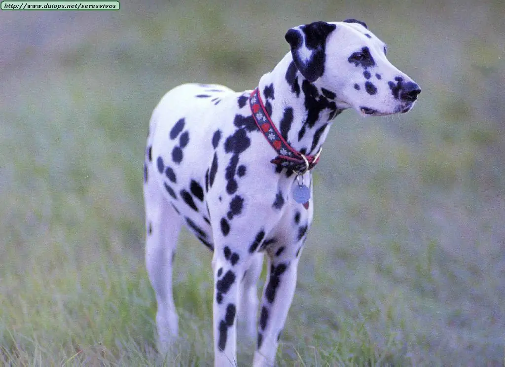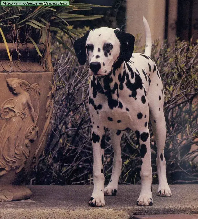 Perro mediano, muy activo, de pelo corto, con su caracteristico manto blanco con manchas redondas de color negro o marron.