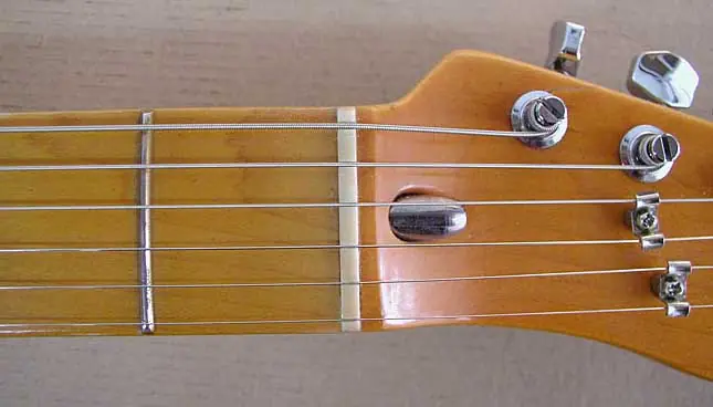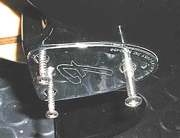 Ese tornillito pequeño que vemos sobresalir de la placa puede accionarse sin desmontar el mástil, tan sólo necesitamos aflojar un poco el tercer tornillo de fijación y mediante una llave Allen de la medida apropiada y apretar en el agujerito del neckplate que nos da acceso al micro tilt. Se trata de un sistema que introdujo Fender en los años 70 para poder ajustar en inclinación el mástil de sus guitarras. Este sistema siempre ha sido criticado porque según algunos resta “contacto” entre mástil y cuerpo con la consiguiente pérdida de transmisión de vibraciones entre ellos. Más adelante, cuando en los años 80 se presentaron los modelos American Standard de telecaster y Stratocaster, este sistema se presentó “evolucionado” y lo llevaban las guitarras ya con neckplate de cuatro tornillos. Muchos modelos de Fender lo siguen incluyendo entre sus “mejoras”