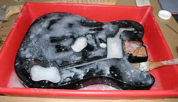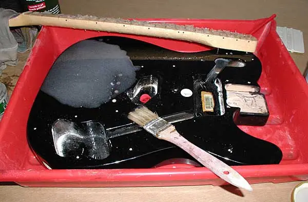 Vamos con la parte “dura” del trabajo. Decapar el cuerpo. AVISO: esto puede llevar HORAS e incluso DÍAS, dependiendo del tipo de pintura y base o tapaporos que tenga el cuerpo. Repetimos el sistema de la cubeta como hemos hecho con el mástil: