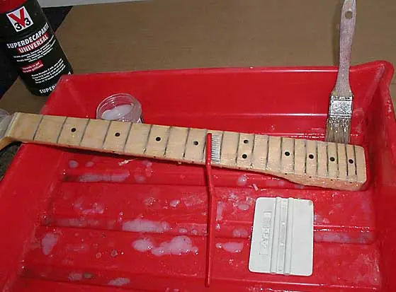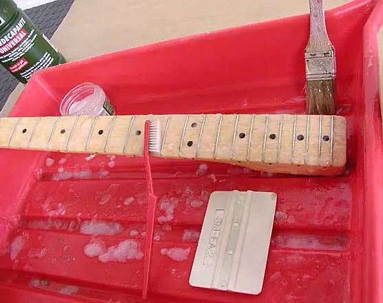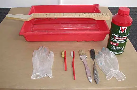 Ahí veis el mástil preparado para ser decapado dispuesto sobre una cubeta (ya veréis más adelante cómo lo preparamos), una espátula pequeña (conviene tener alguna de plástico), un par de cepillitos (uno de dientes y uno de púas finitas), unos guantes, una pinceleta y el gel decapante.