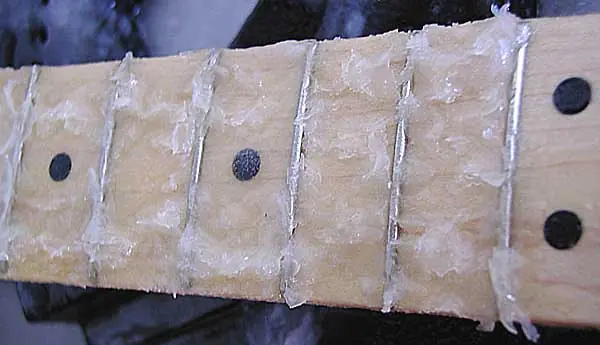Una vez que hemos terminado de decapar el mástil, limpiamos el mismo con un trapo humedecido en disolvente para comprobar que retiramos todo los restos de laca y gel decapante y ya lo tenemos listos para el lijado.