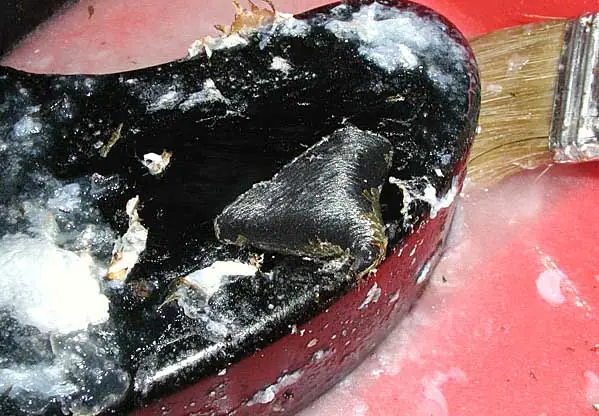 Nos valemos de una espátula o rasqueta de plástico para ir “renovando” el producto sobre el mástil e ir retirando el decapante y restos de laca que ya va saliendo a modo de escamas o costras, como podéis observar en esta otra foto