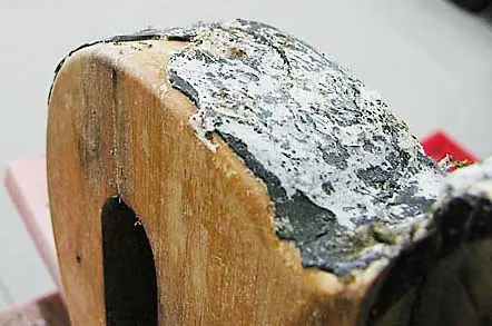 Aquí vemos cómo va actuando el decapante y ya podemos ver el aspecto que tiene la madera que esconde esa gruesa capa de poliuretano: