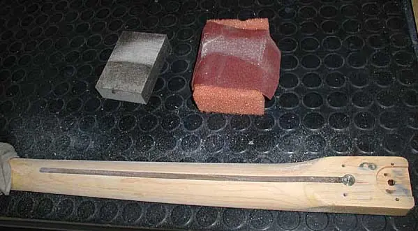 Vamos con el mástil. Se trata de lijar cada vez con lijas muy finas en el sentido de la veta. Como veis en esta foto, yo me he servido de una esponja blandita sobre la que he envuelto la lija, con el fin de adaptarme a la curvatura del mástil:
